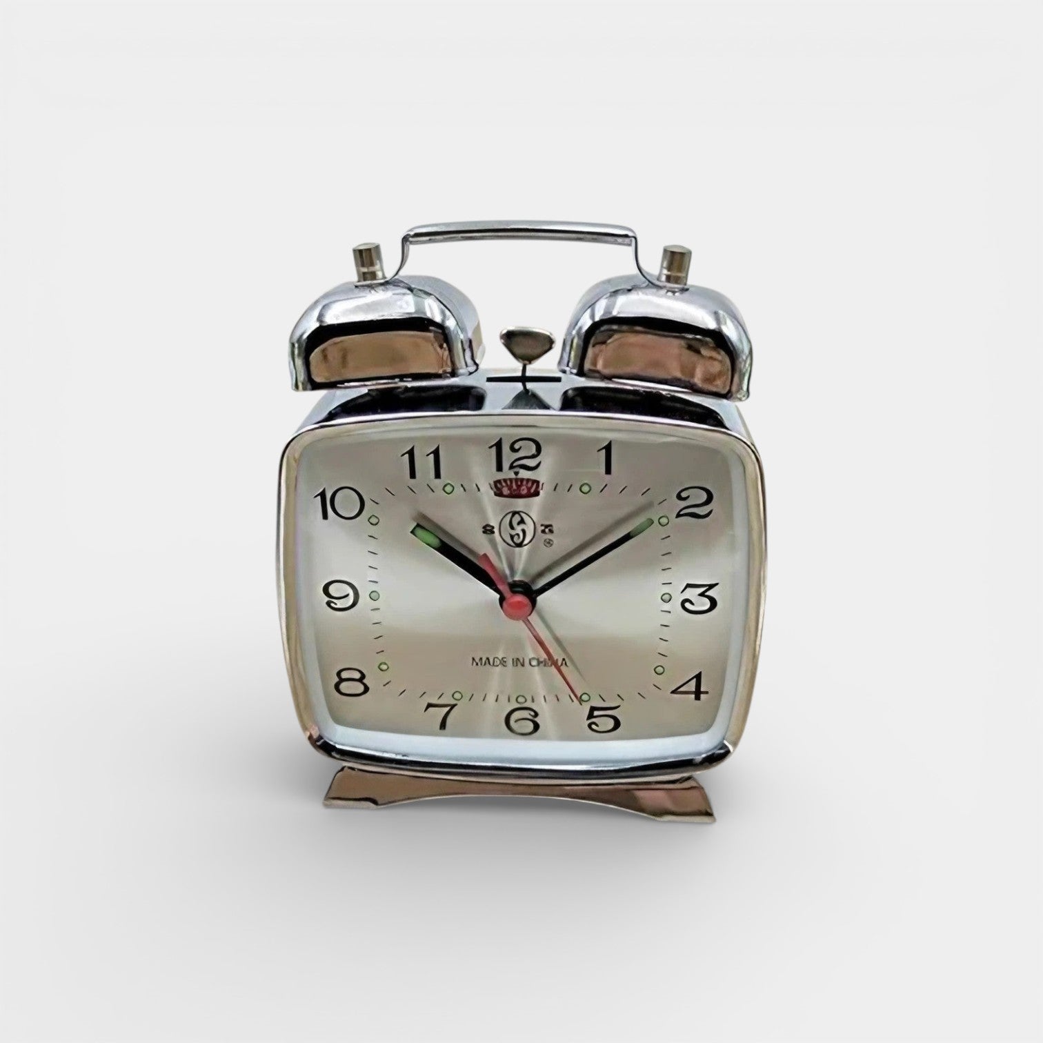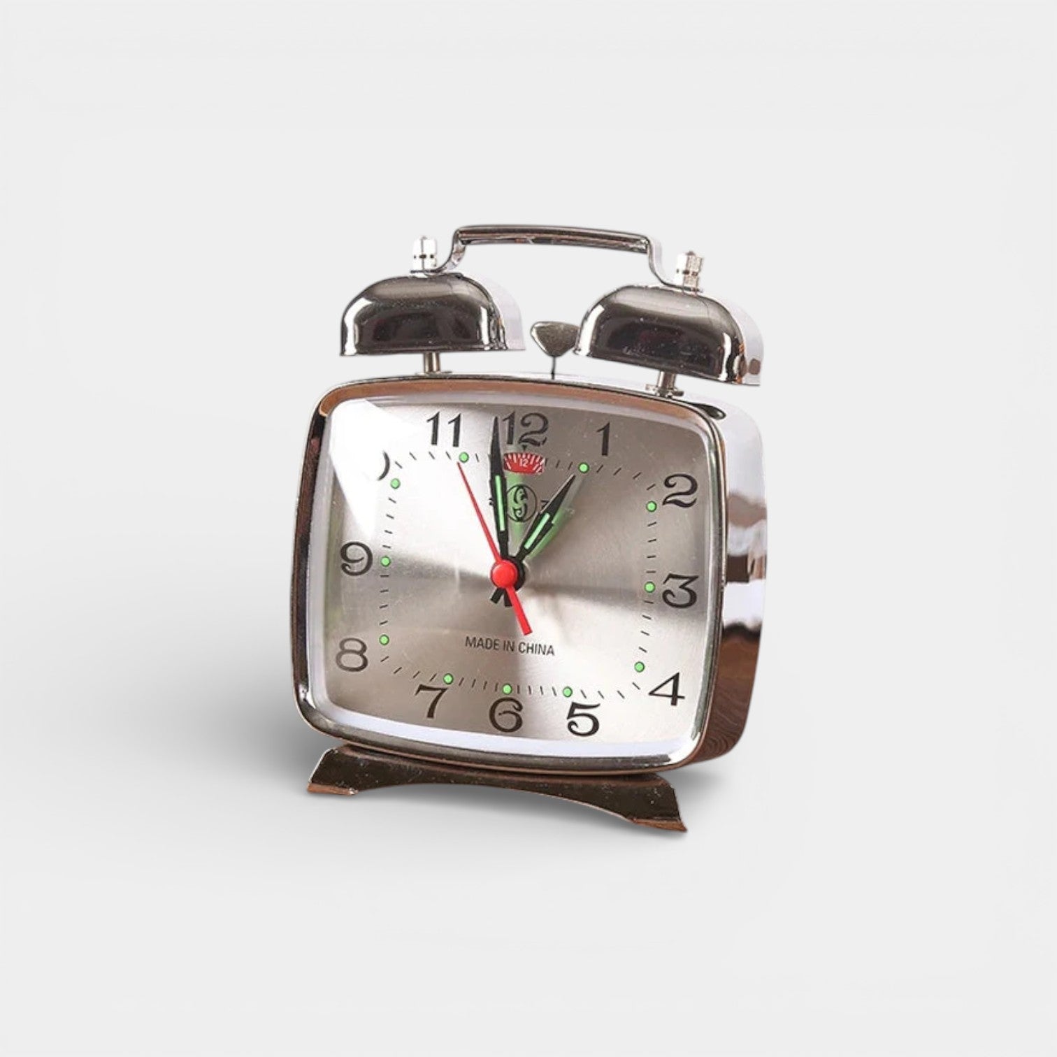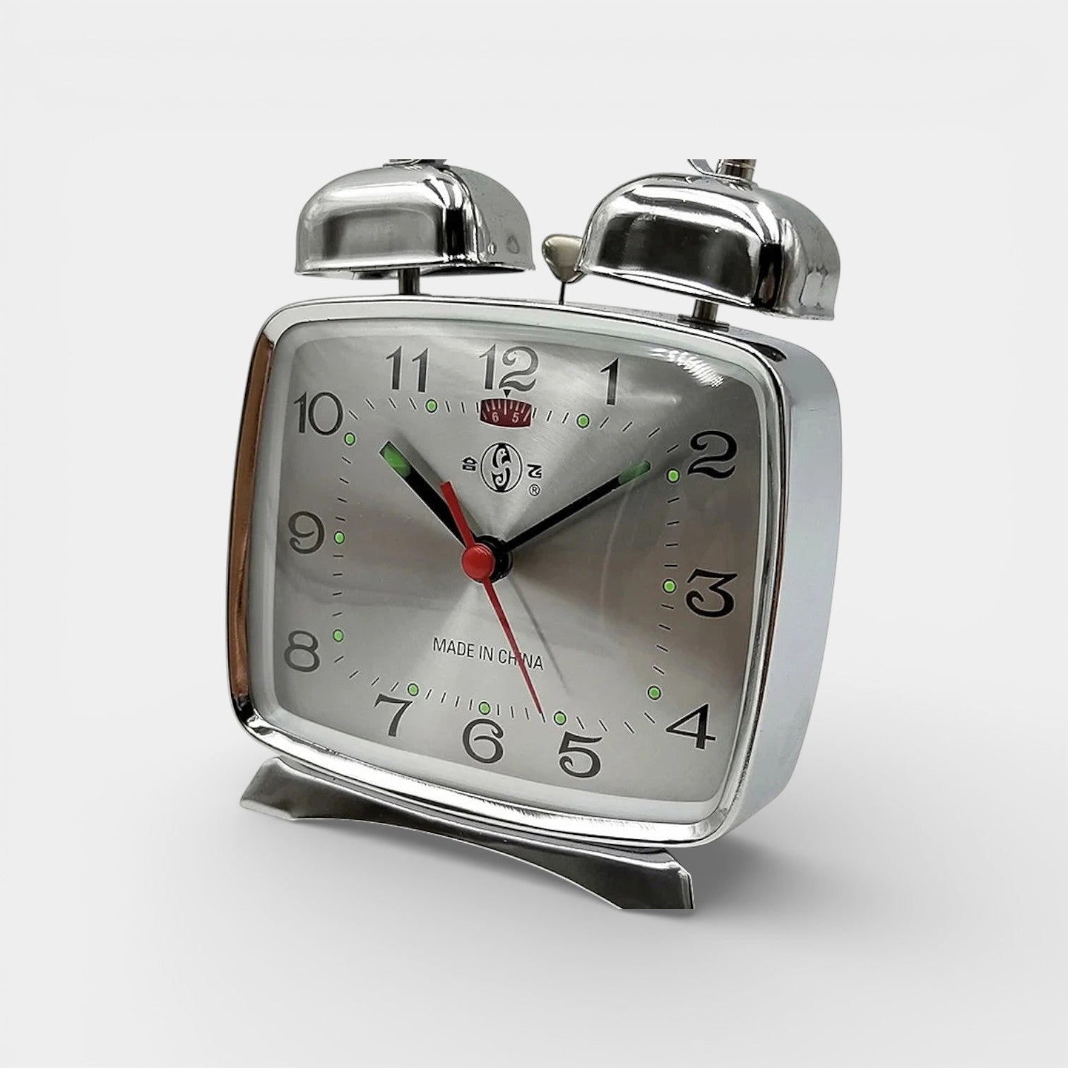 Fabriqué entièrement en métal et doté d’une élégante finition argentée, ce réveil affiche un style rétro intemporel qui s’intègre parfaitement dans un intérieur vintage ou classique. Sa conception soignée met en valeur la forme emblématique à double cloche, symbole des réveils d’antan. Les dimensions exactes du réveil sont de 15 × 10 × 4 cm, offrant une présence visuelle marquée sans encombrer la table de nuit.