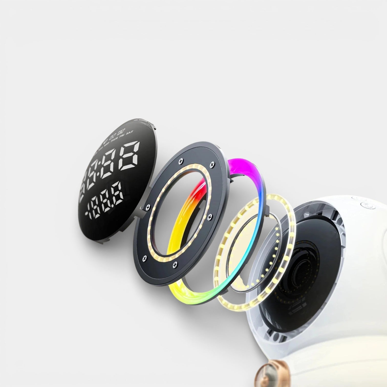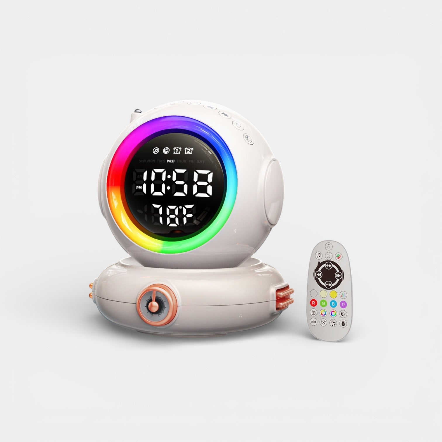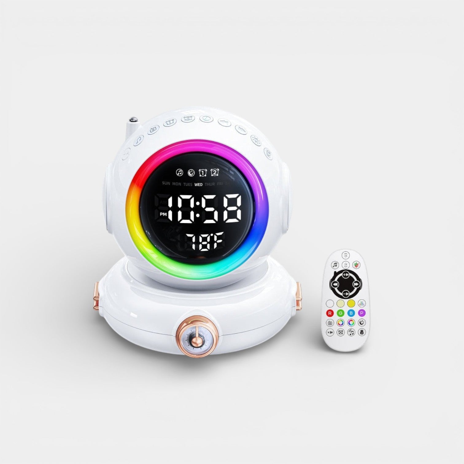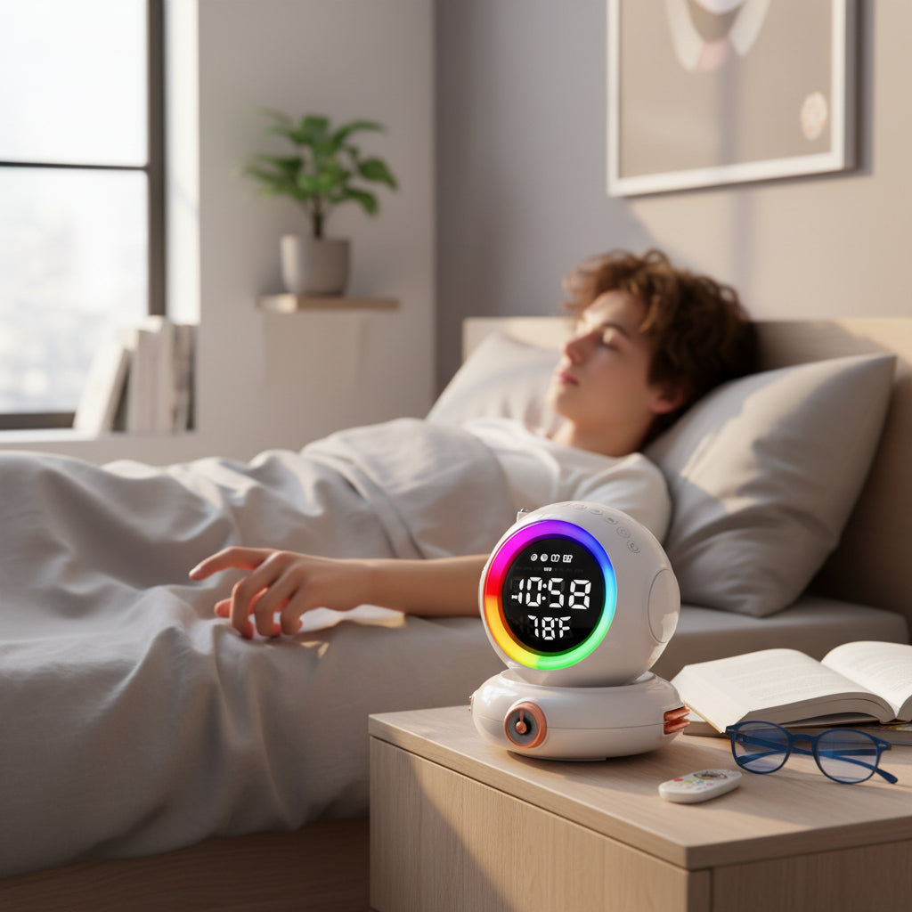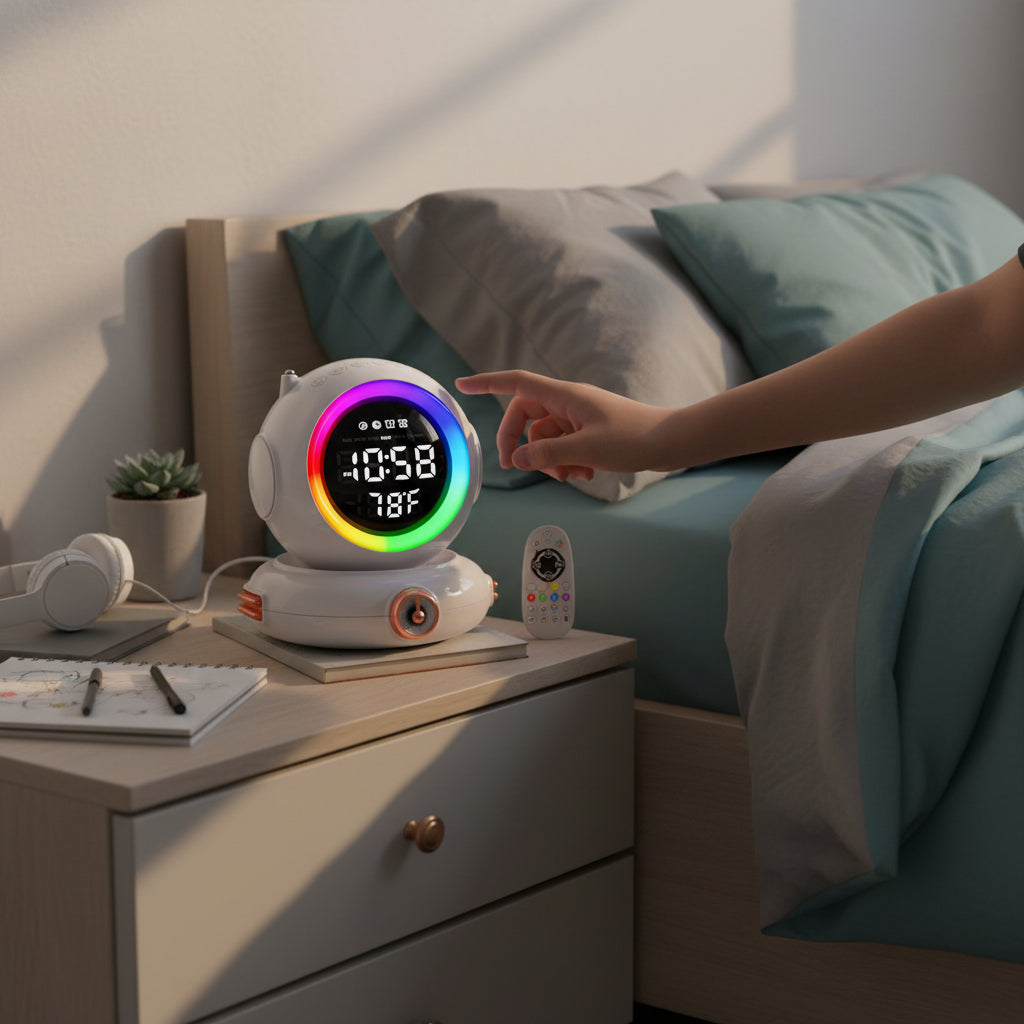 Avec son design blanc futuriste inspiré de l’univers de l’astronomie, ce réveil s’intègre parfaitement dans une chambre d’adolescent. Fabriqué en ABS, il est à la fois léger et robuste. Il intègre une veilleuse à 7 couleurs, une radio FM, la connectivité Bluetooth, ainsi que l’affichage de la température. Les dimensions exactes du réveil sont de 13,5 × 12 × 12 cm, offrant une bonne stabilité sur une table de nuit.