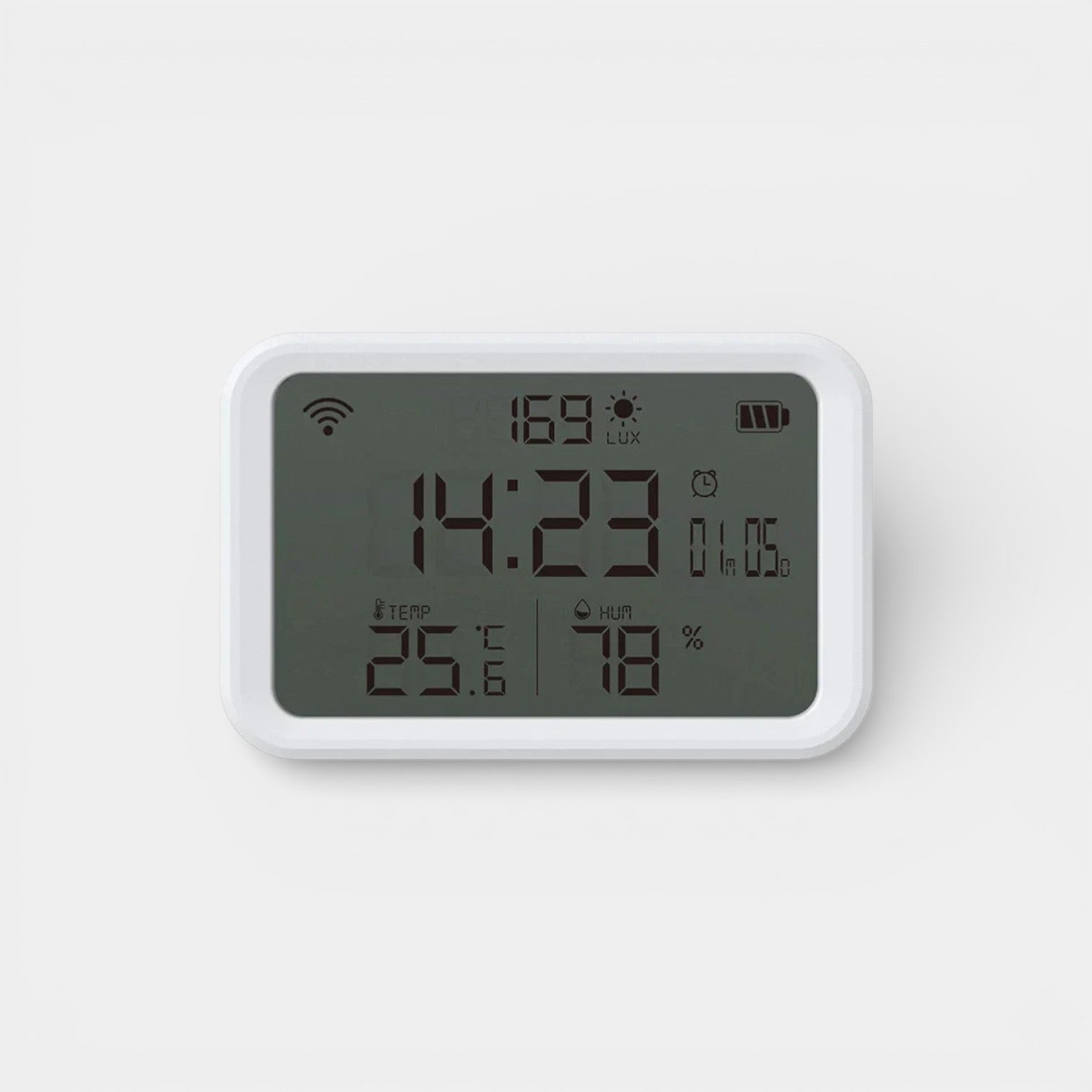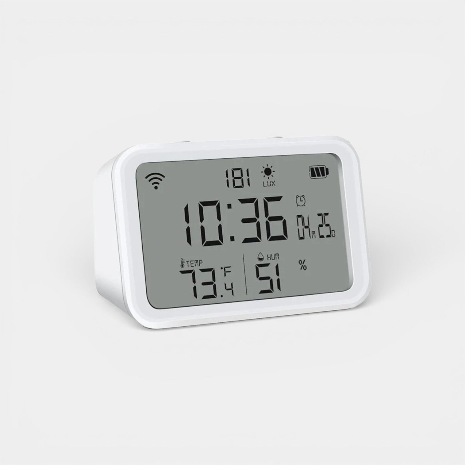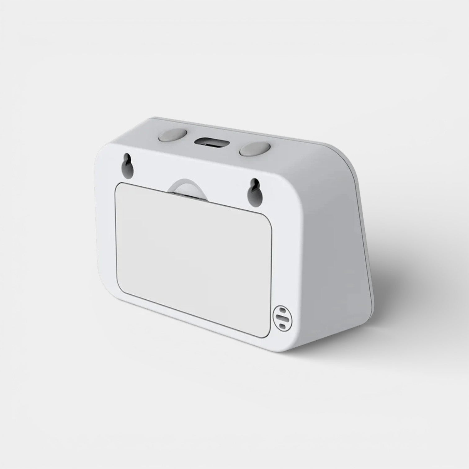 Ce réveil connecté arbore un design épuré et moderne au format rectangle arrondi, habillé d'un blanc immaculé qui s'intègre harmonieusement à n'importe quelle chambre. Son écran LCD offre une lisibilité parfaite, affichant simultanément l'heure, la température, l'humidité et le niveau de luminosité ambiant. Compact et polyvalent, il peut être posé sur une table de nuit ou accroché au mur selon vos préférences. Dimensions : 8,5 x 5,5 x 3 cm, il trouve sa place partout sans encombrer votre espace.