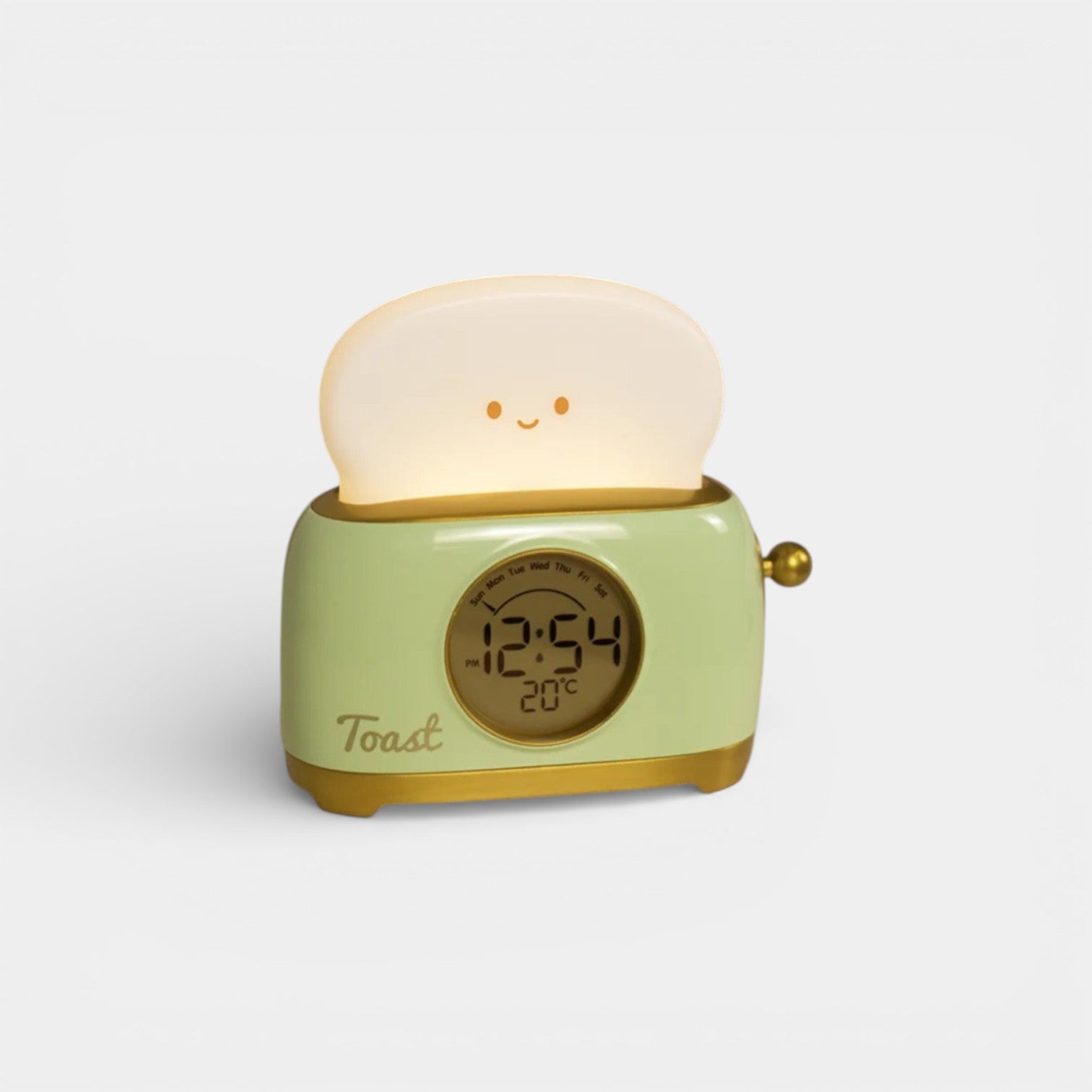 Ce réveil a tout compris : pour qu'un enfant utilise son réveil avec plaisir, il faut qu'il soit fun, rassurant et facile à comprendre. Avec son design grille-pain et sa petite tranche de pain lumineuse qui sourit, ce réveil devient un vrai compagnon de chambre. Votre enfant voit d'un coup d'œil l'heure, le jour de la semaine et même la température de sa chambre sur le grand écran numérique clair. La veilleuse intégrée diffuse une lumière douce et apaisante qui le rassure la nuit, sans l'éblouir. Le matin, l'alarme le réveille en douceur, et son design coloré (jaune ou vert) met tout de suite de bonne humeur. Vous gagnez des matins plus sereins, et votre enfant gagne en autonomie en comprenant mieux le temps qui passe.