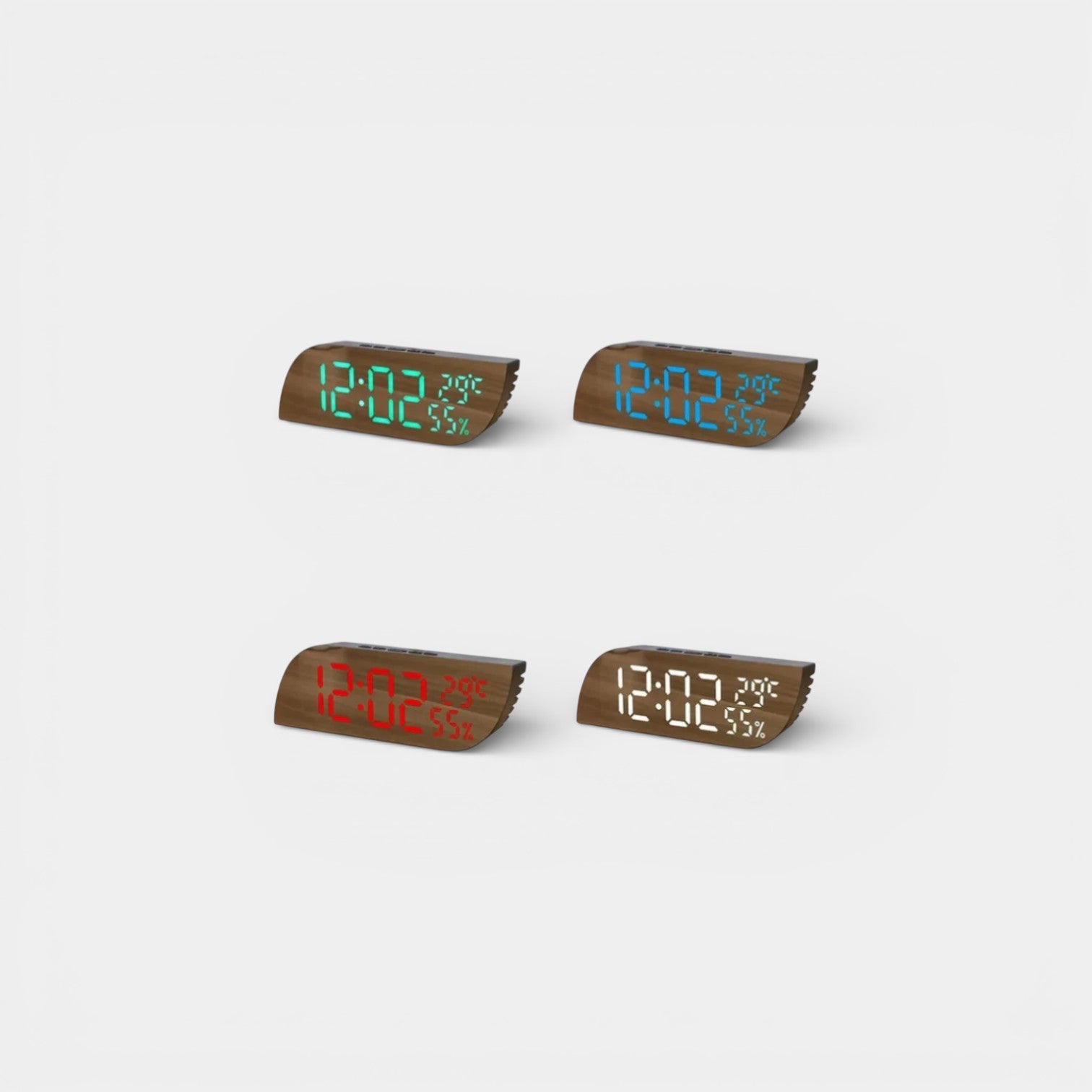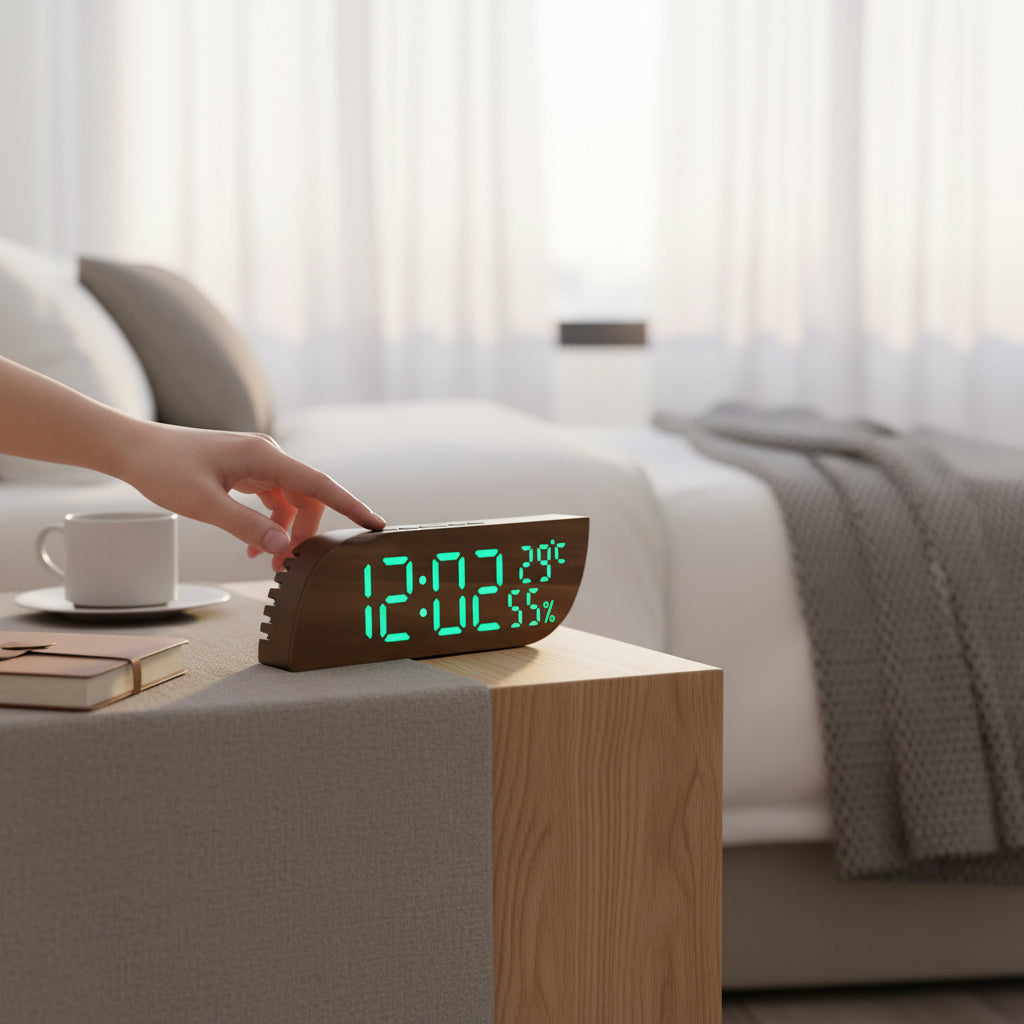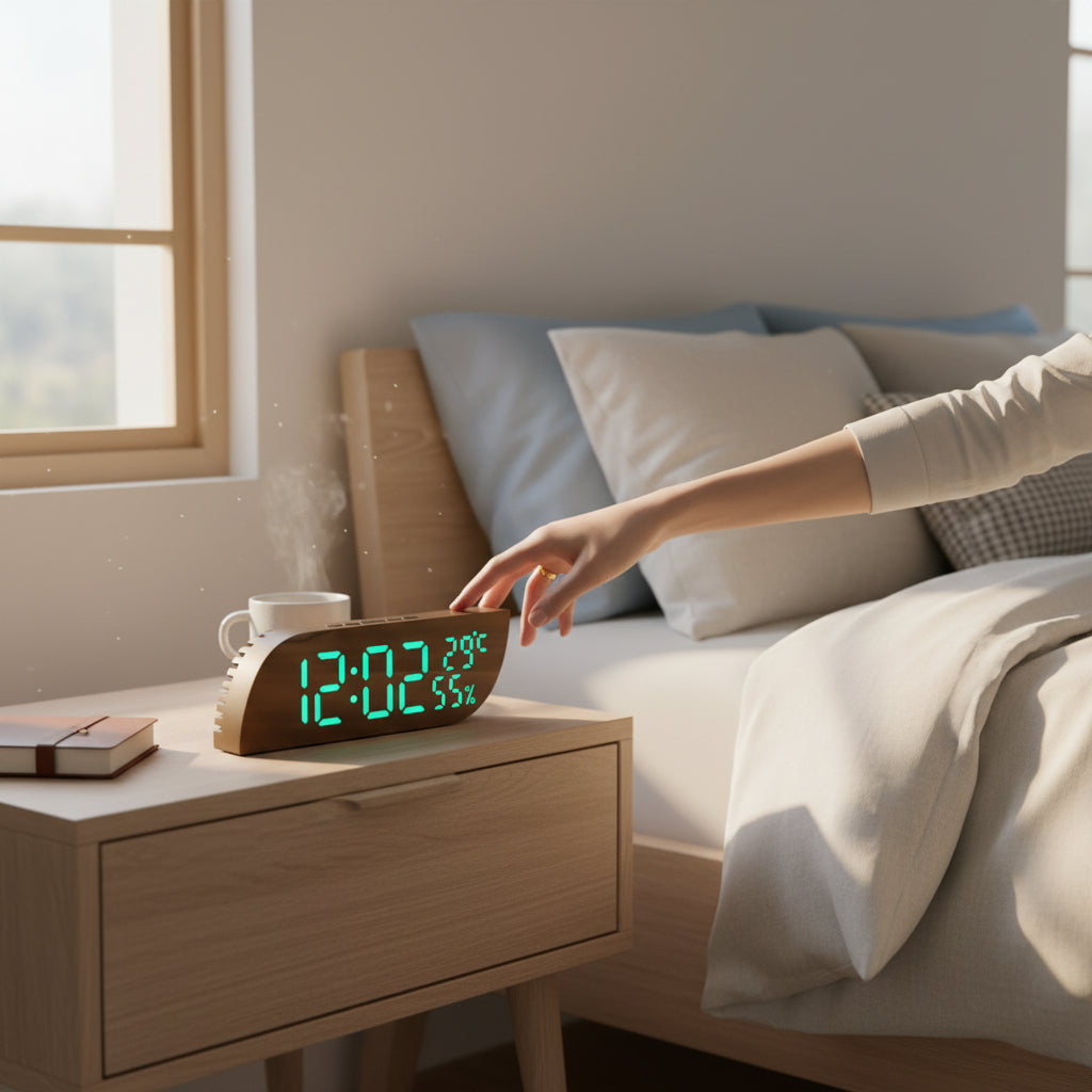 Ce réveil a compris ce dont vous avez vraiment besoin : voir l'heure clairement, savoir s'il fait trop chaud ou trop sec dans votre chambre, et surtout, ne pas être ébloui en pleine nuit. L'écran LED affiche simultanément l'heure, la température et l'humidité : trois informations essentielles pour optimiser votre environnement de sommeil. Un air trop sec ou une chambre mal chauffée peuvent vraiment gâcher vos nuits, et avec ce réveil, vous le savez tout de suite. Les 3 niveaux de luminosité vous permettent d'ajuster l'intensité selon le moment : très bas la nuit pour préserver votre sommeil, moyen le soir, lumineux le jour. Le mode nuit automatique réduit encore la luminosité pour ne jamais vous déranger. Les 3 alarmes programmables vous donnent toute la flexibilité nécessaire : une pour vous, une pour votre partenaire, ou différentes selon les jours de la semaine. Le design moderne avec sa bordure en vague apporte une touche d'élégance à votre table de nuit. Disponible en 5 couleurs d'affichage LED (blanc, rouge, bleu, vert, blanc/vert), vous choisissez celle qui vous plaît le plus.